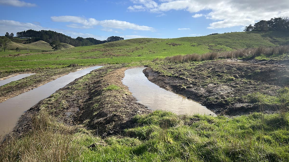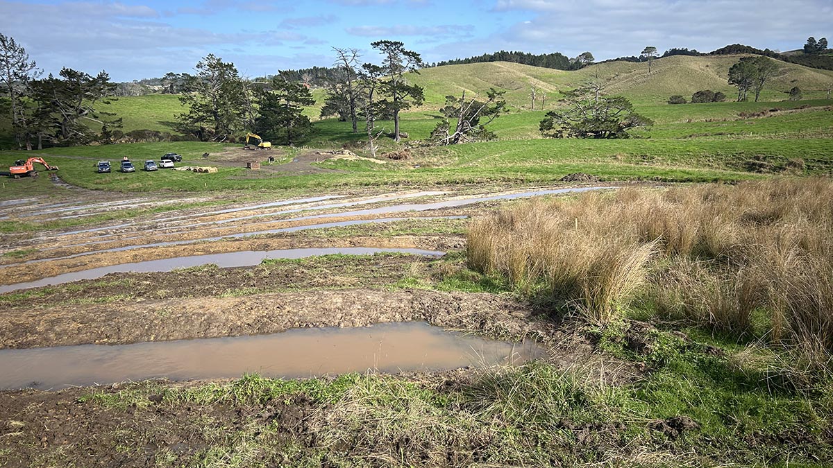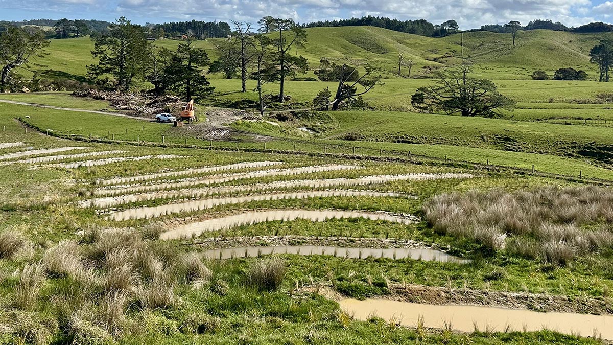 The site has naturally poorly drained soils, hence the bunds detain surface runoff, sub-soil discharges, and any perched water spring discharges, which subsequently seep slowly into the ground. Bordered by native hydrophytic vegetation planting, they create a sustained saturated environment emulating the natural wetlands on lower sloped land or at springs in gully heads.